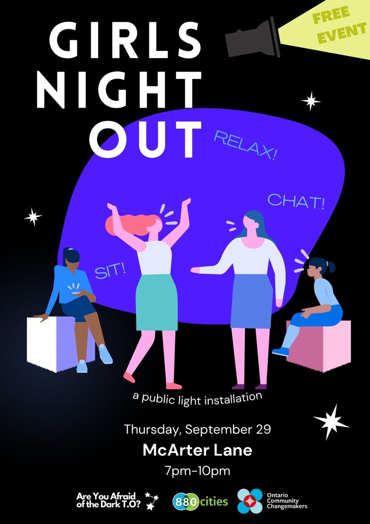 The constant fear of dangerous men often leads women to avoid certain spaces, especially at specific times. Are You Afraid of the Dark T.O.? envisions ways to empower young women and girls to be present in public spaces after dark by providing new public seating and lighting sources. The project began with the desire to help women and girls reclaim space and show that we belong in the public realm